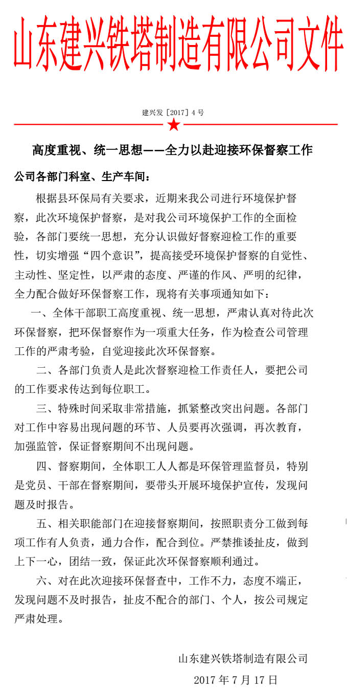【通知】高度重视、统一思想全力以赴迎接环保督察工作的通知