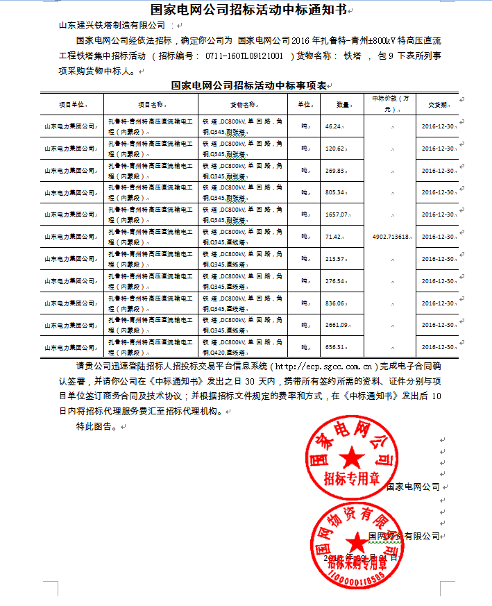 我公司中标扎鲁特-青州±800kV特高压直流工程包9